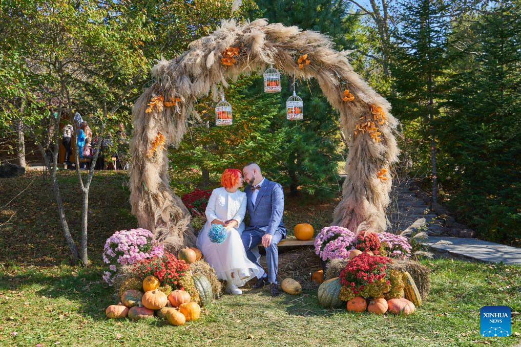 A couple pose for photos with a decoration at the pumpkin festival in Vladivostok, Russia, Oct. 7, 2023. A pumpkin festival was held on the outskirts of Vladivostok on Saturday to celebrate the harvest season. (Photo by Guo Feizhou/Xinhua)