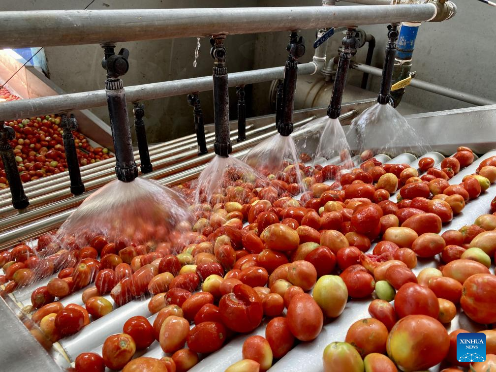 This photo taken on Oct. 7, 2023 shows tomatoes in processing at Afghanistan's first-ever tomato paste plant in Kandahar Province, Afghanistan. The plant has been established here and began operation recently, head of Kandahar Industrial Park Mufti Ali Mohammad said Thursday. (Photo by Arghand/Xinhua)