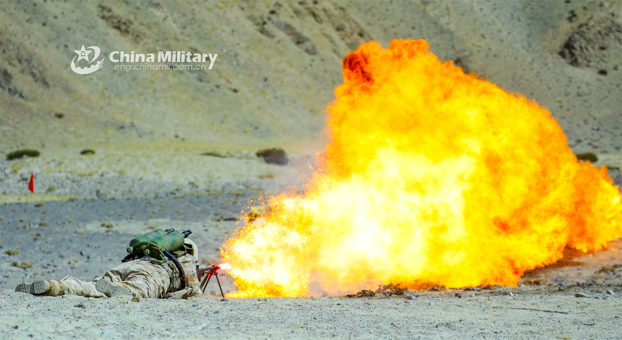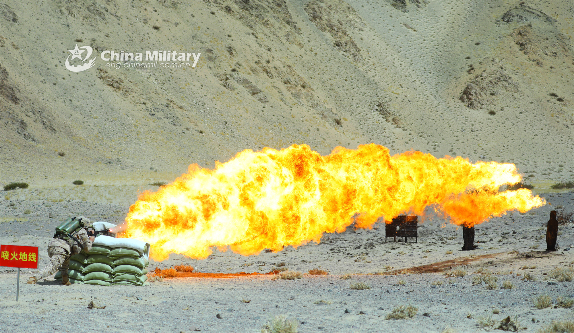 A soldier assigned to a chemical-defense element with a brigade of the army uses the flamethrower to ignite a controlled fire to burn down the targets during an attacking drill in late September, 2023. (eng.chinamil.com.cn/photo by Cao Xuguang)