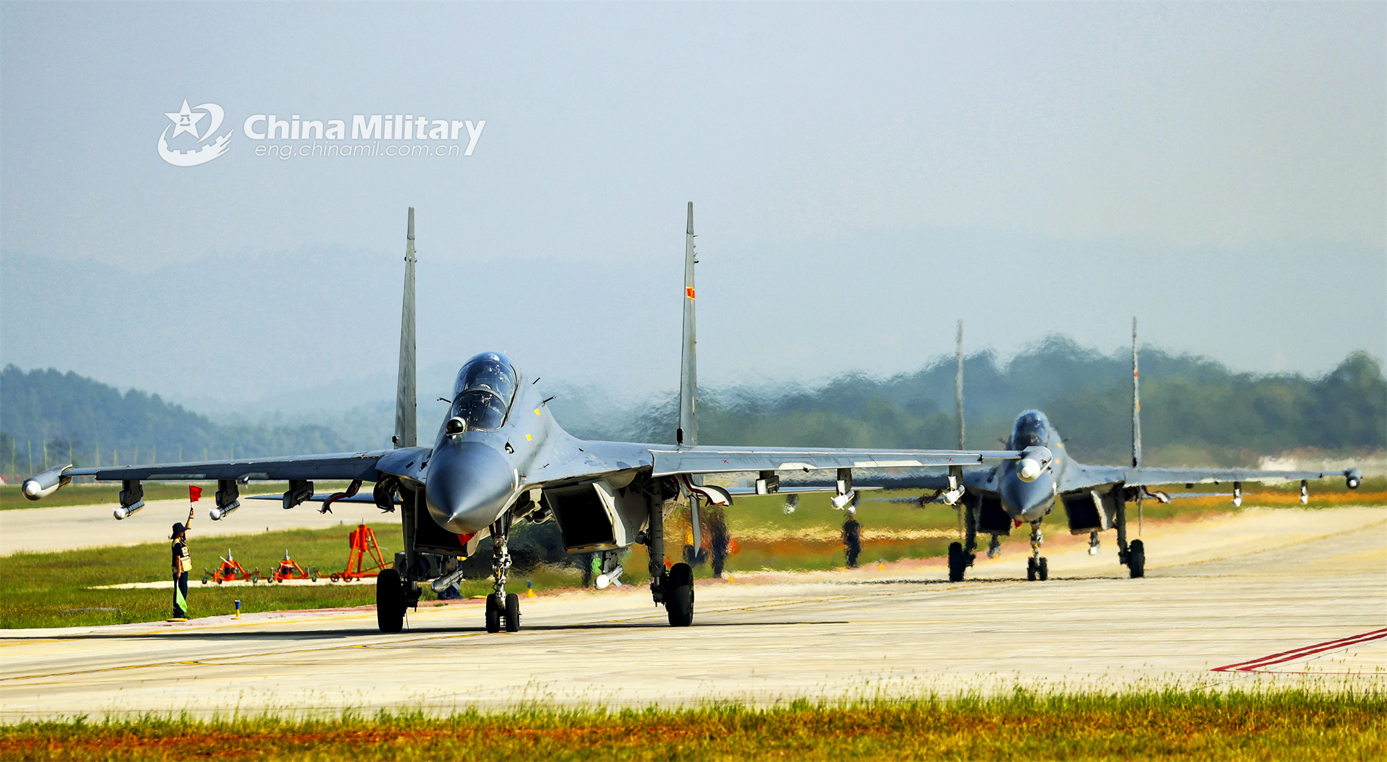 Two fighter jets attached to an aviation brigade of the air force under the PLA Southern Theater Command taxi in close formation before takeoff for a real-combat training exercise on September 15, 2023. (eng.chinamil.com.cn/Photo by Zhang Qiang)