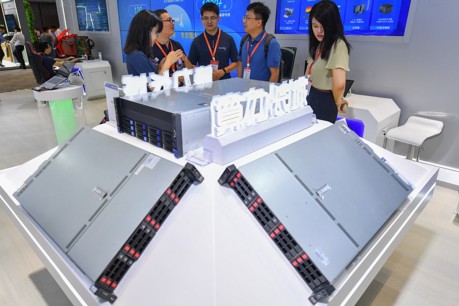 Visitors learn about AI servers during the 2023 World Computing Conference in Changsha, central China's Hunan Province, Sept. 15, 2023. (Xinhua/Chen Zeguo)