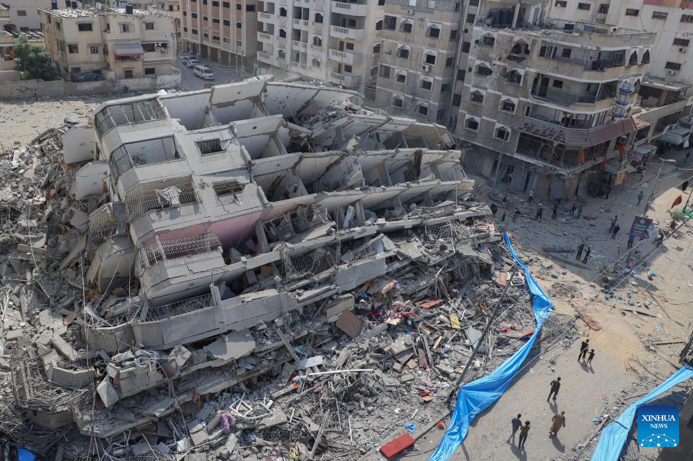 This photo taken on Oct. 8, 2023 shows destroyed buildings following an Israeli airstrike in Gaza City. At least 493 Palestinians have been killed and 2,751 others wounded in Israeli airstrikes on the Gaza Strip, the Hamas-run health ministry said on Monday, while Israel's state-owned Kan TV news reported the death toll in Israel has reached 700. (Photo by Rizek Abdeljawad/Xinhua)