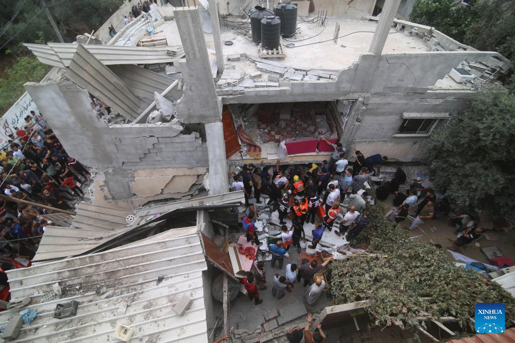 People remove a person from a destroyed building following an Israeli airstrike in the southern Gaza Strip city of Rafah on Oct. 9, 2023. At least 493 Palestinians have been killed and 2,751 others wounded in Israeli airstrikes on the Gaza Strip, the Hamas-run health ministry said on Monday. At least 800 people have been killed in the mass assault launched by the Palestinian Islamic Resistance Movement (Hamas) on Israel, Israel's state-owned Kan TV news reported on Monday. (Photo by Khaled Omar/Xinhua)