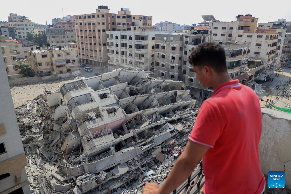 A man looks at destroyed buildings following an Israeli airstrike in Gaza City, Oct. 8, 2023. At least 493 Palestinians have been killed and 2,751 others wounded in Israeli airstrikes on the Gaza Strip, the Hamas-run health ministry said on Monday, while Israel's state-owned Kan TV news reported the death toll in Israel has reached 700. (Photo by Rizek Abdeljawad/Xinhua)
