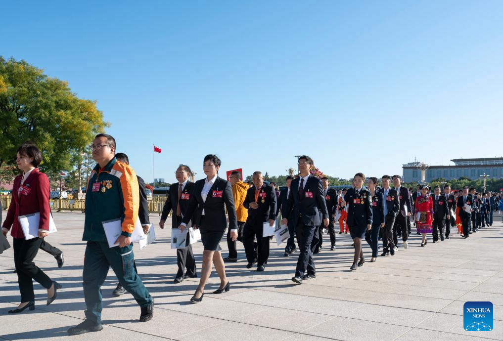 Delegates walk to the Great Hall of the People to attend the 18th National Congress of the All-China Federation of Trade Unions (ACFTU) in Beijing, capital of China, Oct 9, 2023. The 18th National Congress of the All-China Federation of Trade Unions (ACFTU) opened in Beijing on Monday morning. [Photo/Xinhua]