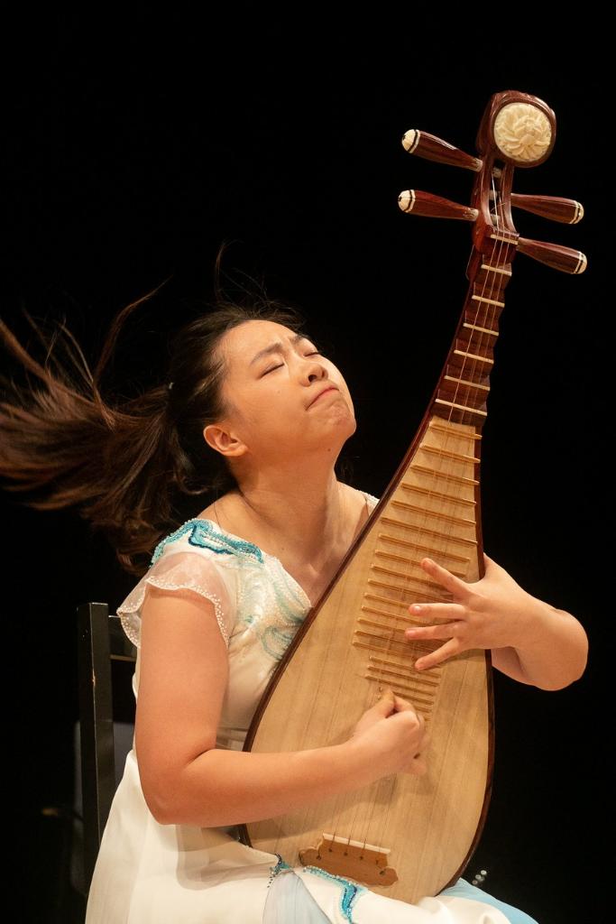 Liu Xiaojing, pipa virtuoso from the Central Conservatory of Music, performs during the U.S.-China Music Forum at The Asia Society in New York, the United States, Oct. 7, 2023. (Photo by Michael Nagle/Xinhua)