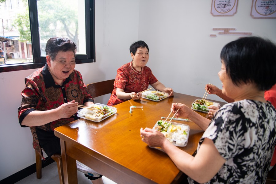Senior residents have lunch at a day-care center for the elderly in Hanshou County of Changde City, central China's Hunan Province, June 20, 2023. (Xinhua/Chen Sihan)