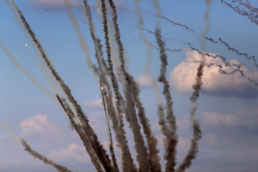A barrage of rockets are fired from Gaza toward Israel over Gaza City, on Oct. 10, 2023. (Photo by Rizek Abdeljawad/Xinhua)