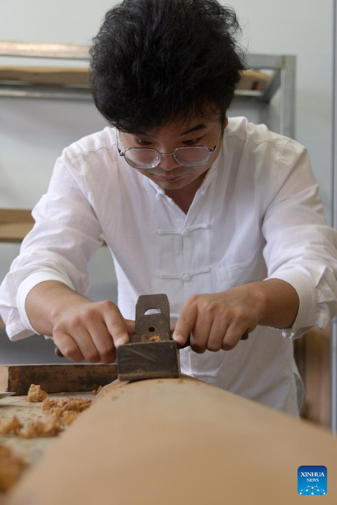 Guqin maker Xu Bing makes Guqin at Lankao County of Kaifeng City, central China's Henan Province, Oct. 9, 2023. (Xinhua/Xing Guangli)