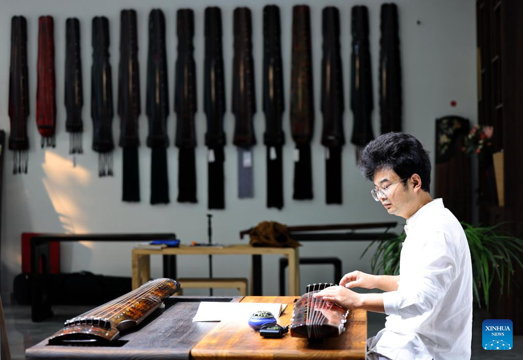 Guqin maker Xu Bing plays the Guqin at Lankao County of Kaifeng City, central China's Henan Province, Oct. 9, 2023. (Xinhua/Xing Guangli)