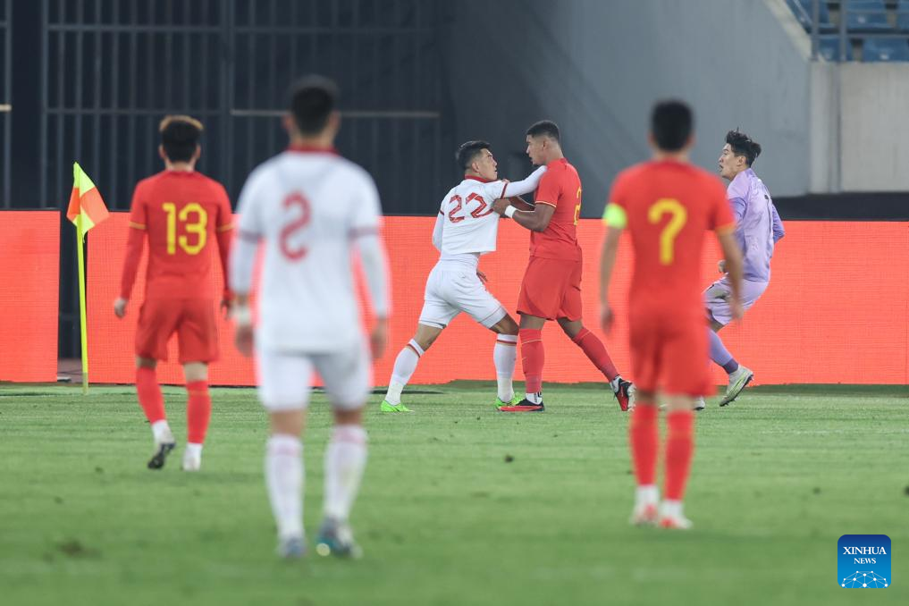 Nguyen Tien Linh (3rd L) of Vietnam and Jiang Guangtai of China clash during an international friendly football match in Dalian, northeast China's Liaoning Province, Oct. 10, 2023. (Xinhua/Pan Yulong)