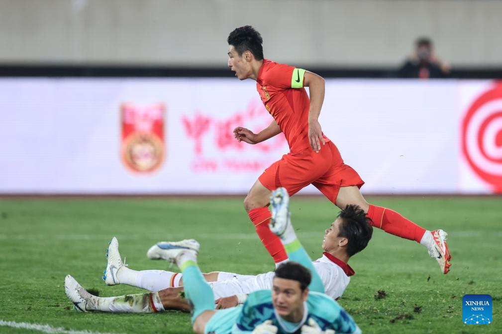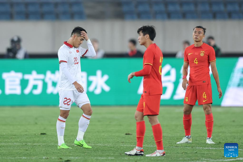 He Yupeng (C) of China passes the ball during an international friendly football match between China and Vietnam in Dalian, northeast China's Liaoning Province, Oct. 10, 2023. (Xinhua/Pan Yulong)