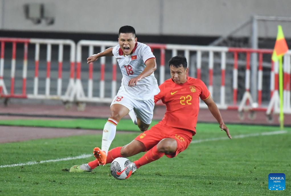 Ho Van Cuong (L) of Vietnam breaks through during an international friendly football match between China and Vietnam in Dalian, northeast China's Liaoning Province, Oct. 10, 2023. (Xinhua/Long Lei)