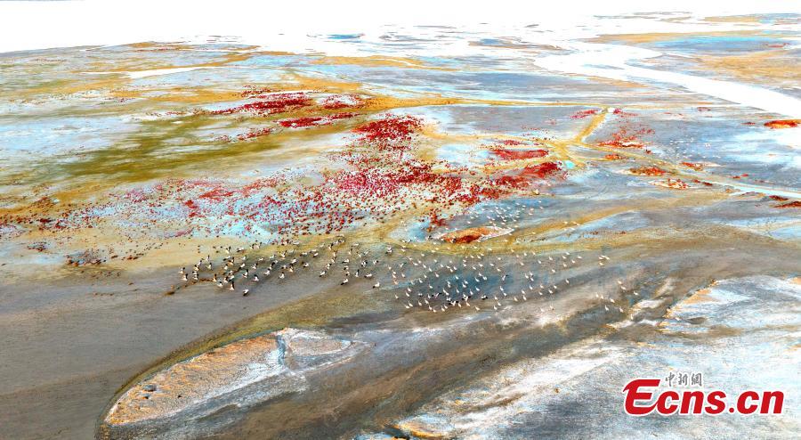 A flock of gray cranes forage at Ebinur Lake wetland natural reserve in Bortala Mongol Autonomous Prefecture, northwest China’s Xinjiang Uyghur Autonomous Region. (Photo: China News Service/Qin Guilian)