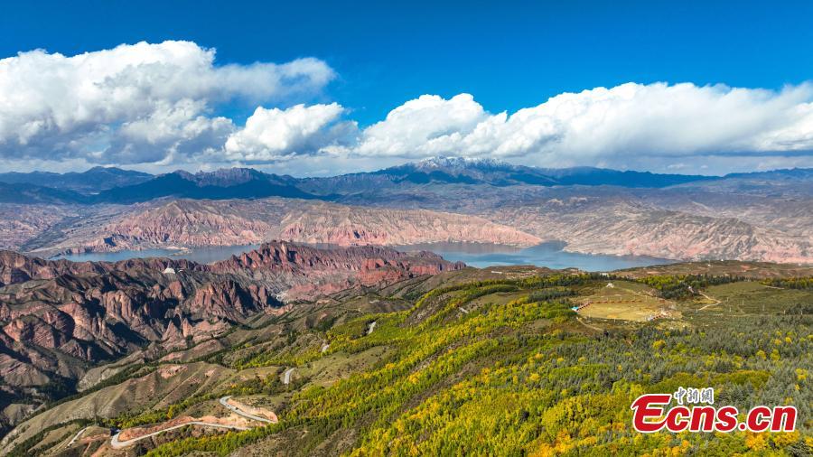 Facing the Yellow River, the Kanbula National Geopark features stone peaks of Danxia landform with golden scenery in autumn in Jianzha County, Huangnan Tibetan Autonomous Prefecture, northwest China's Qinghai Province. It is a "historical documentary" of the evolvement of the rise of the Qinghai-Tibet Plateau and its climate. (Photo provided to China News Service)