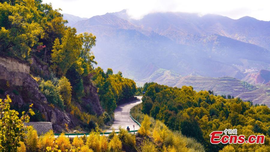 Facing the Yellow River, the Kanbula National Geopark features stone peaks of Danxia landform with golden scenery in autumn in Jianzha County, Huangnan Tibetan Autonomous Prefecture, northwest China's Qinghai Province. It is a "historical documentary" of the evolvement of the rise of the Qinghai-Tibet Plateau and its climate. (Photo provided to China News Service)