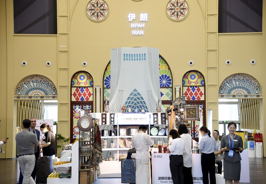 This photo taken on June 15, 2023 shows the Iran Pavilion during the 2023 SCO International Investment and Trade Expo in Qingdao, east China's Shandong Province. (Xinhua/Li Ziheng)