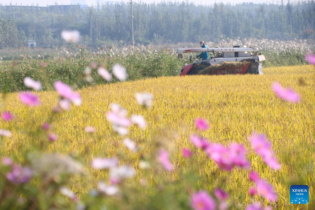A villager harvests rice at a paddy field in Qilipu Village of Jinan, east China's Shandong Province, Oct. 11, 2023. (Photo by Hao Xincheng/Xinhua)