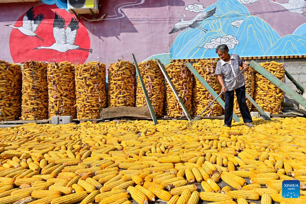 A farmer airs corns at Wangjianian Village of Qingzhou City, east China's Shandong Province, Oct. 11, 2023. (Photo by Wang Jilin/Xinhua)