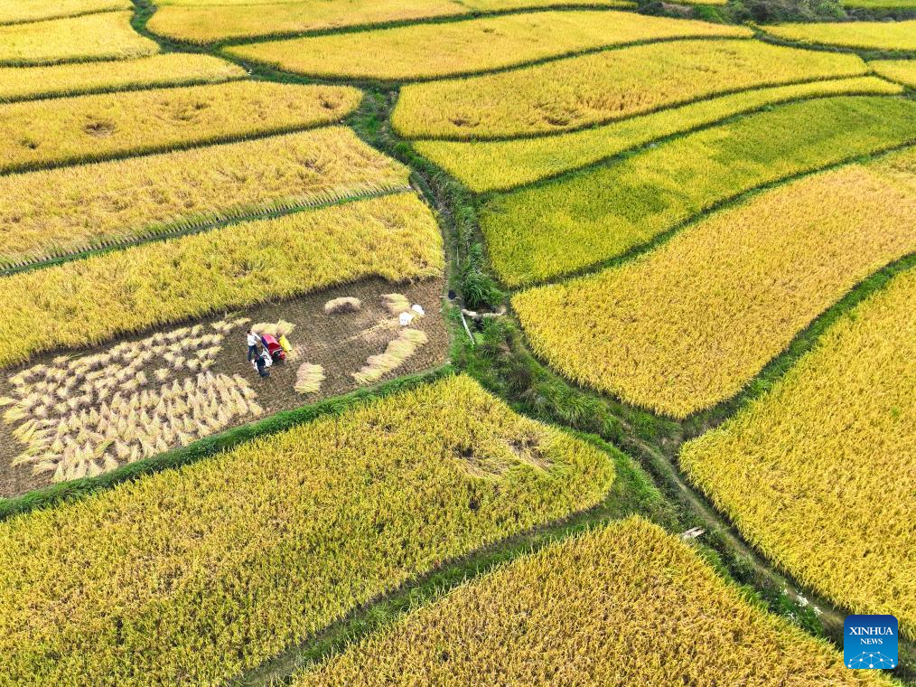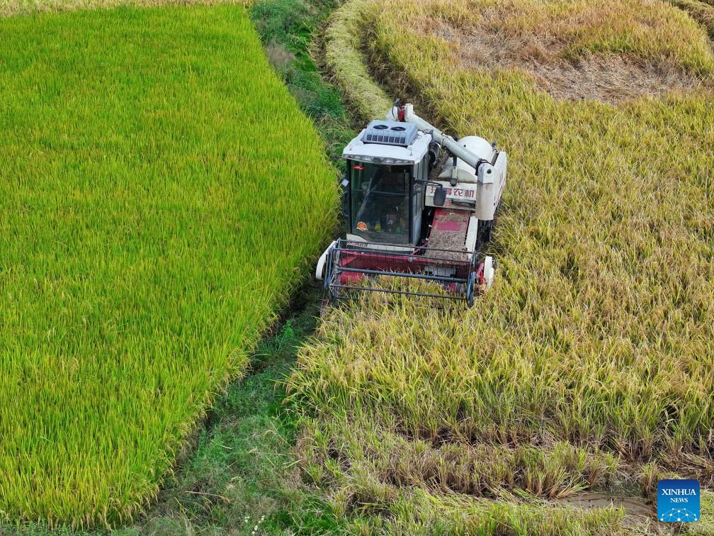 This aerial photo taken on Oct. 11, 2023 shows farmers harvesting rice at a paddy field in Weizi Village of Changsha, central China's Hunan Province. (Xinhua/Chen Zeguo)