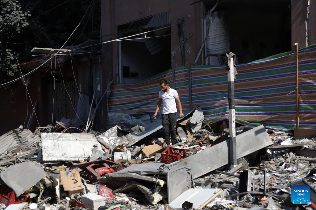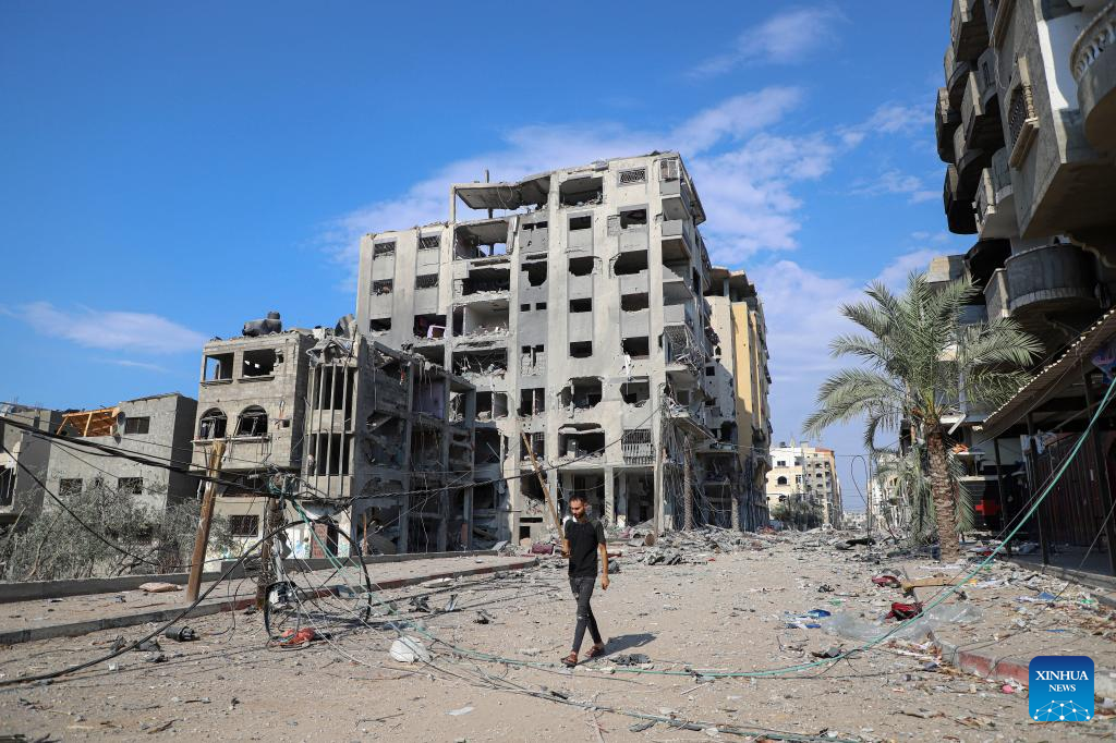 A Palestinian man walks past buildings destroyed in Israeli airstrikes in Gaza City, on Oct. 11, 2023. (Photo by Rizek Abdeljawad/Xinhua)