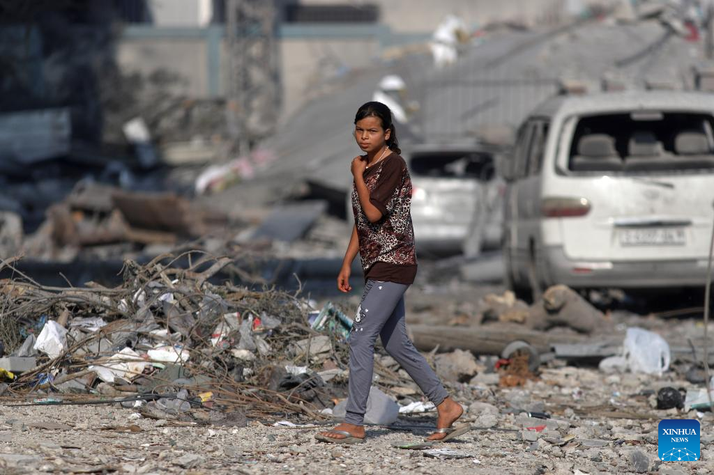 A girl walks past buildings destroyed in Israeli airstrikes in Gaza City, on Oct. 11, 2023. (Photo by Rizek Abdeljawad/Xinhua)