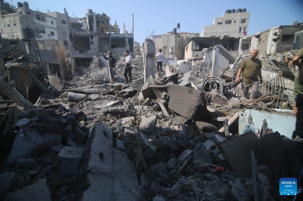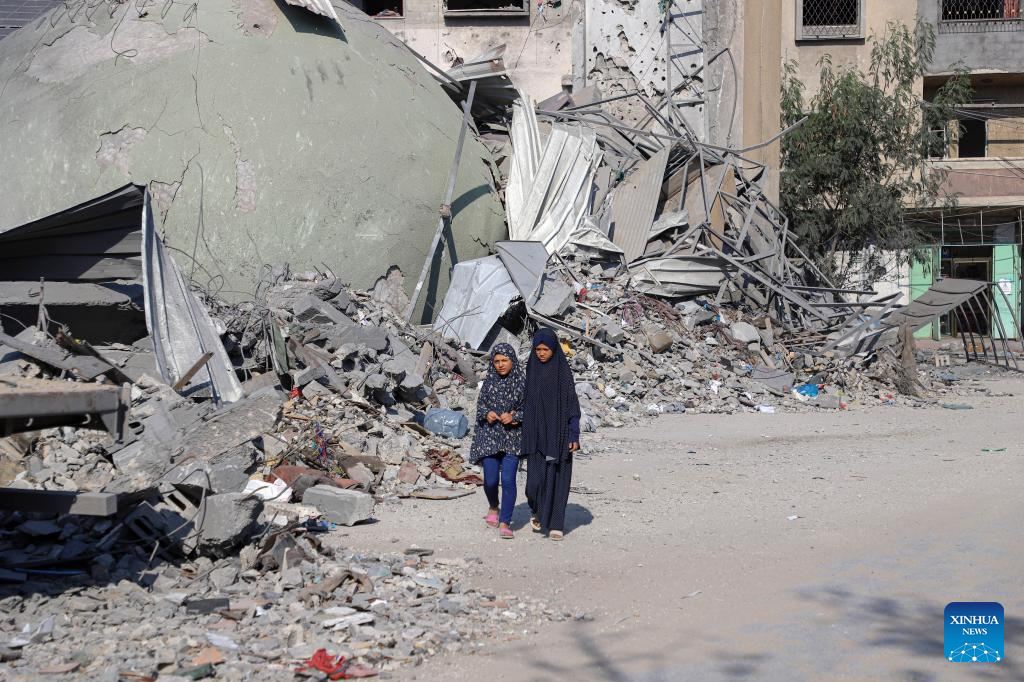 Palestinians walk past buildings destroyed in Israeli airstrikes in Gaza City, on Oct. 11, 2023. (Photo by Rizek Abdeljawad/Xinhua)