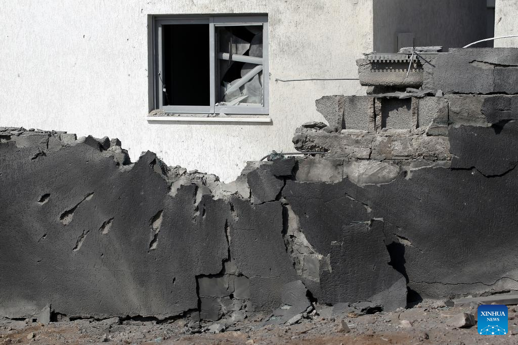 Photo taken on Oct. 11, 2023 shows a wall damaged in rocket attacks from Gaza, in Ashkelon, Israel. (Ilan Assayag/JINI via Xinhua)