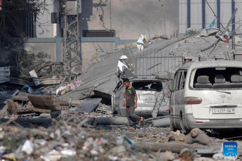 A boy walks past buildings destroyed in Israeli airstrikes in Gaza City, on Oct. 11, 2023. (Photo by Rizek Abdeljawad/Xinhua)