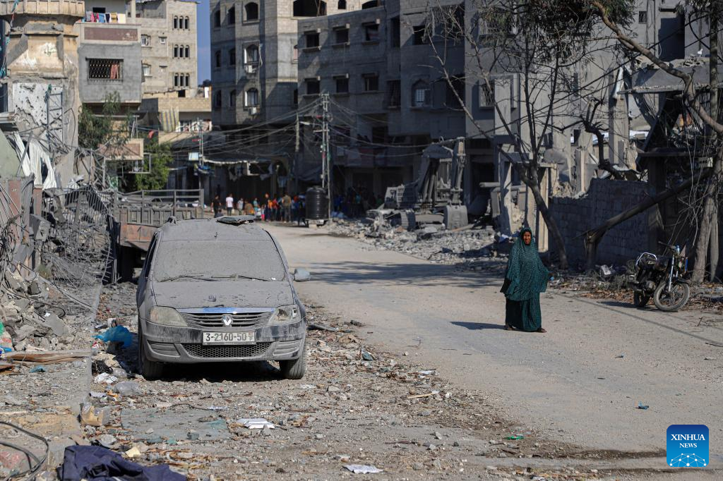 A Palestinian woman walks past buildings destroyed in Israeli airstrikes in Gaza City, on Oct. 11, 2023. (Photo by Rizek Abdeljawad/Xinhua)