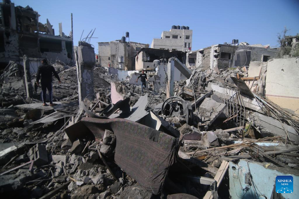 People inspect buildings destroyed in Israeli airstrikes in the southern Gaza Strip city of Rafah, on Oct. 11, 2023. (Photo by Khaled Omar/Xinhua)