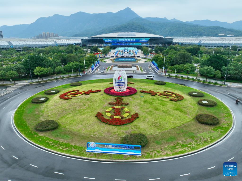 This aerial photo taken on Oct. 11, 2023 shows the main venue of the World Marine Equipment Conference 2023 in Fuzhou, southeast China's Fujian Province.?(Xinhua/Jiang Kehong)