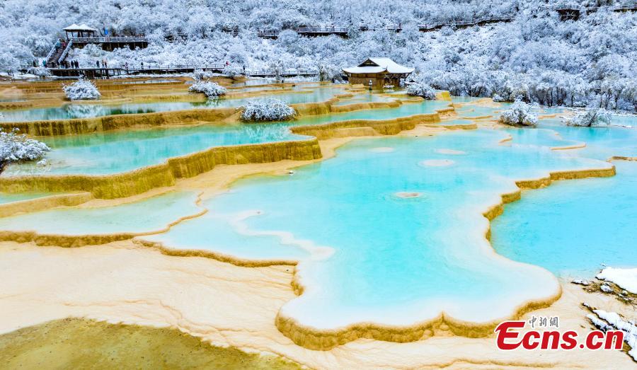 Beautiful ponds and surrounding mountains are blanketed with snow, resembling a charming wonderland at Huanglong Scenic and Historic Interest Area in Songpan County, southwest China's Sichuan Province, Oct. 12, 2023. Famous for its colorful water pools, snow mountains, deep valleys and forests, Huanglong was listed as one of UNESCO world heritage sites in1992. (Photo: China News Service/Jiang Yuebin)