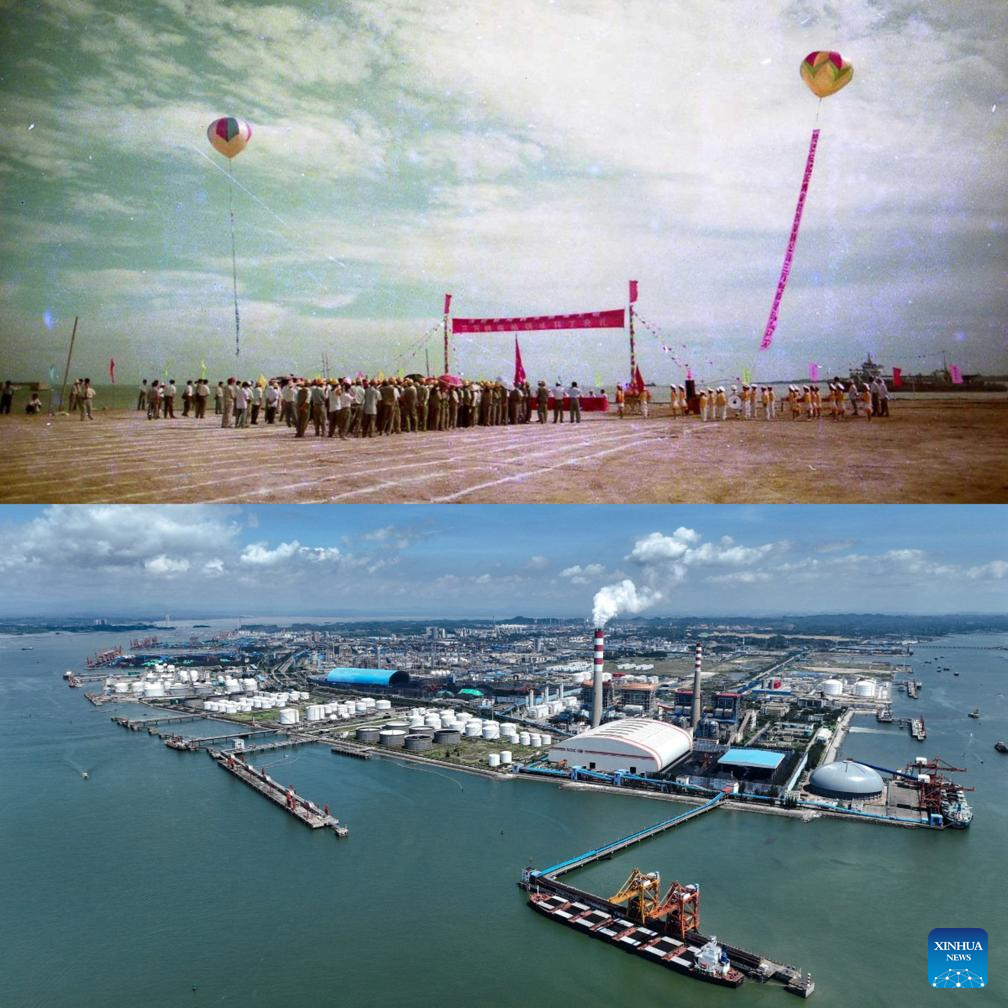 This combo photo shows a wharf for energy transportation under construction on July 24, 1997, (upper) and the aerial view of the wharf for energy transportation on Aug. 28, 2022, (below, photo taken by Xinhua photographer Zhang Ailin) at the Qinzhou Port in Qinzhou, south China's Guangxi Zhuang Autonomous Region. (Xinhua)