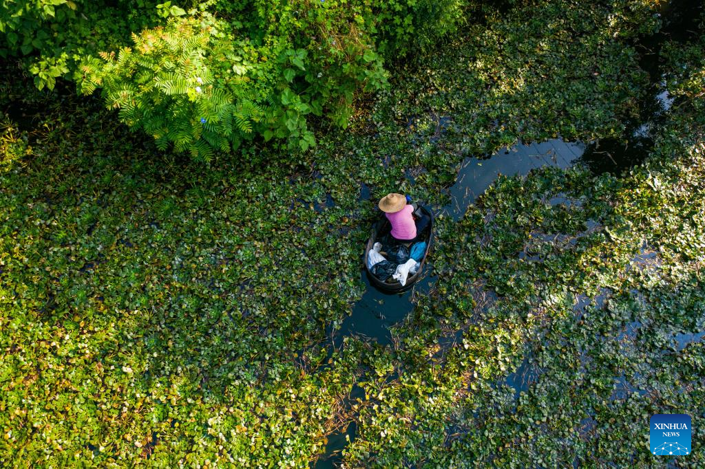This aerial photo taken on Oct. 12, 2023 shows a villager picking water caltrops in Donglin Town of Huzhou City, east China's Zhejiang Province. (Xinhua/Xu Yu)