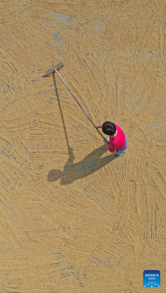 This aerial photo taken on Oct. 12, 2023 shows a farmer drying grains in Xianju County of Taizhou City, east China's Zhejiang Province. (Photo by Wang Huabin/Xinhua)