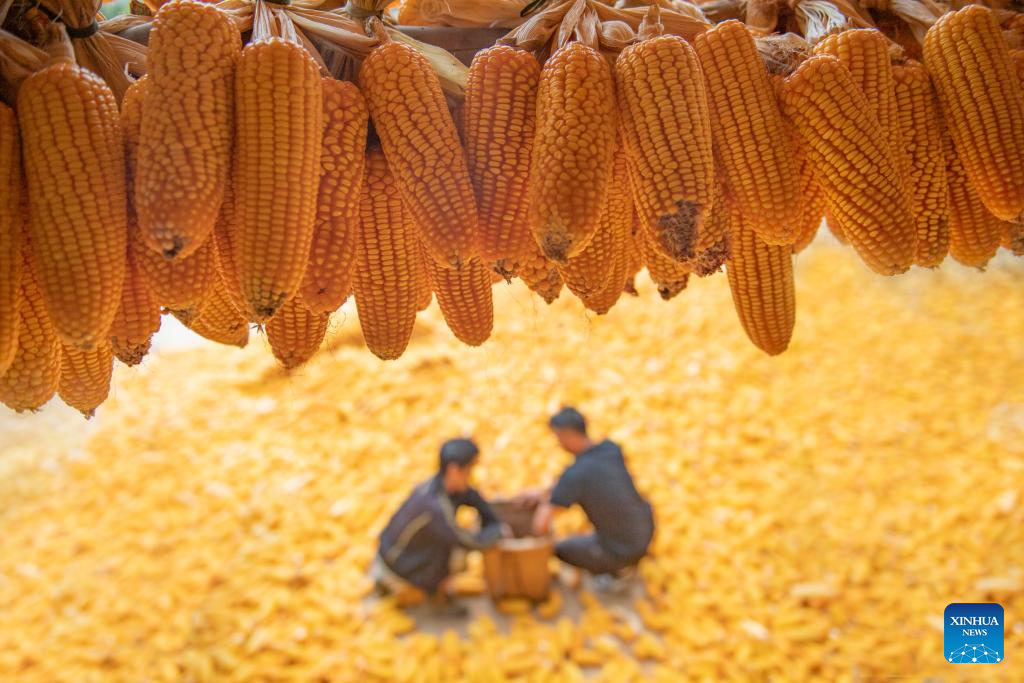 Farmers dry corns in Wenshan City of Wenshan Zhuang and Miao Autonomous Prefecture, southwest China's Yunnan Province, Oct. 12, 2023. (Photo by Xiong Pingxiang/Xinhua)