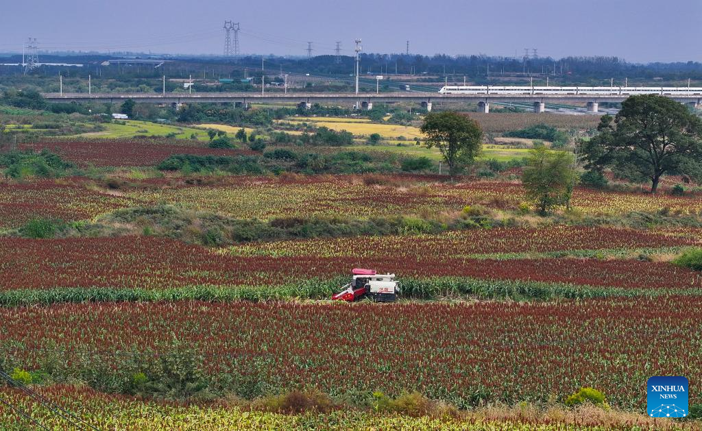 This aerial photo taken on Oct. 12, 2023 shows a farmer operating a harvester to harvest sorghum in Mingchuan Town of Feixi County, Hefei City, east China's Anhui Province. (Photo by Xu Yong/Xinhua)