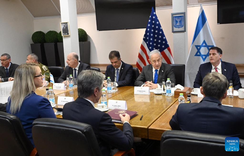 Israeli Prime Minister Benjamin Netanyahu (2nd R, Rear) meets with U.S. Secretary of State Antony Blinken (C, Front) at the HaKirya military base in Tel Aviv, Israel, on Oct. 12, 2023. U.S. Secretary of State Antony Blinken arrived in Israel on Thursday, pledging support and more weapon deliveries for Israel. (Haim Zach/GPO/Handout via Xinhua)