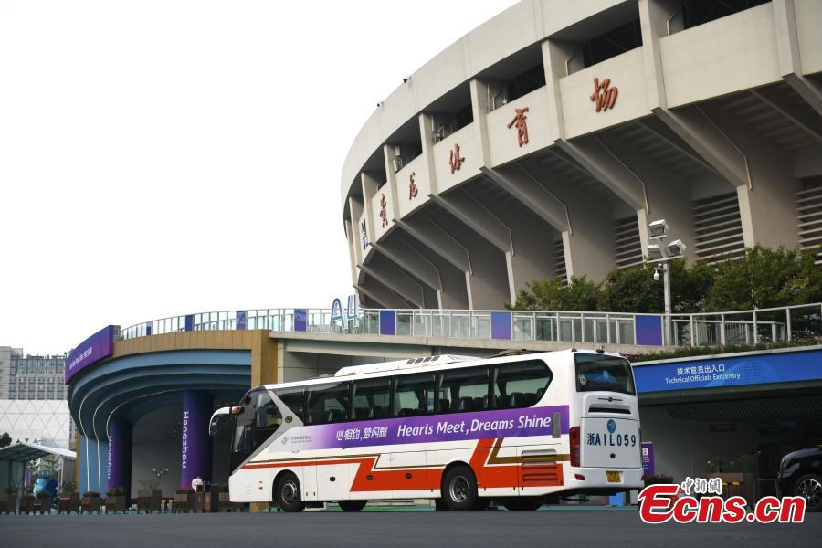 A barrier-free shuttle bus stops outside Huanglong Sports Center in Hangzhou, east China's Zhejiang Province, Oct. 12, 2023. (Photo: China News Service/Wang Gang)