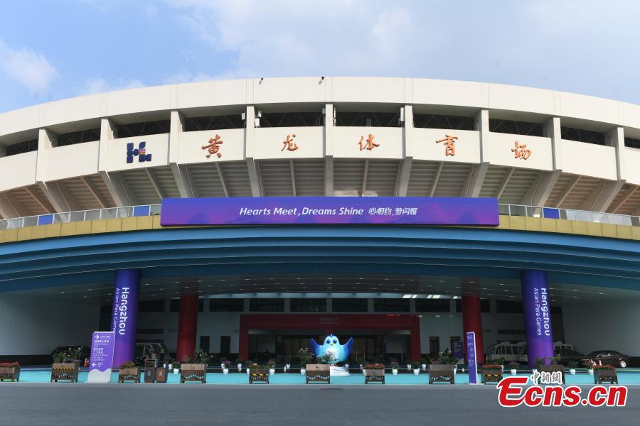 Huanglong Sports Center Gymnasium is decorated with banners for the upcoming 4th Asian Para Games in Hangzhou, east China's Zhejiang Province, Oct. 12, 2023. (Photo: China News Service/Wang Gang)