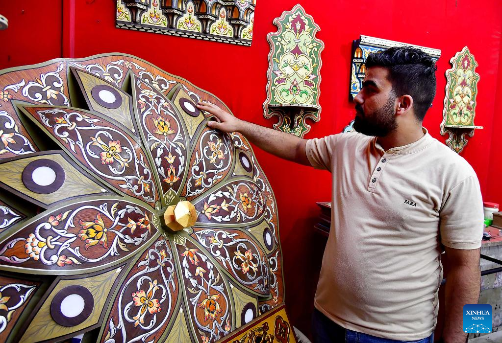 A craftsman is pictured at a fair called "Craft Project" which features over 20 traditional craftsmen in old Damascus, Syria, Oct. 12, 2023. This three-day event showcases a wide range of traditional crafts, including Damascene painting, engraving, metalwork, glass art, stained glass, glass blowing, mosaic, carpets and brocade. (Photo by Ammar Safarjalani/Xinhua)