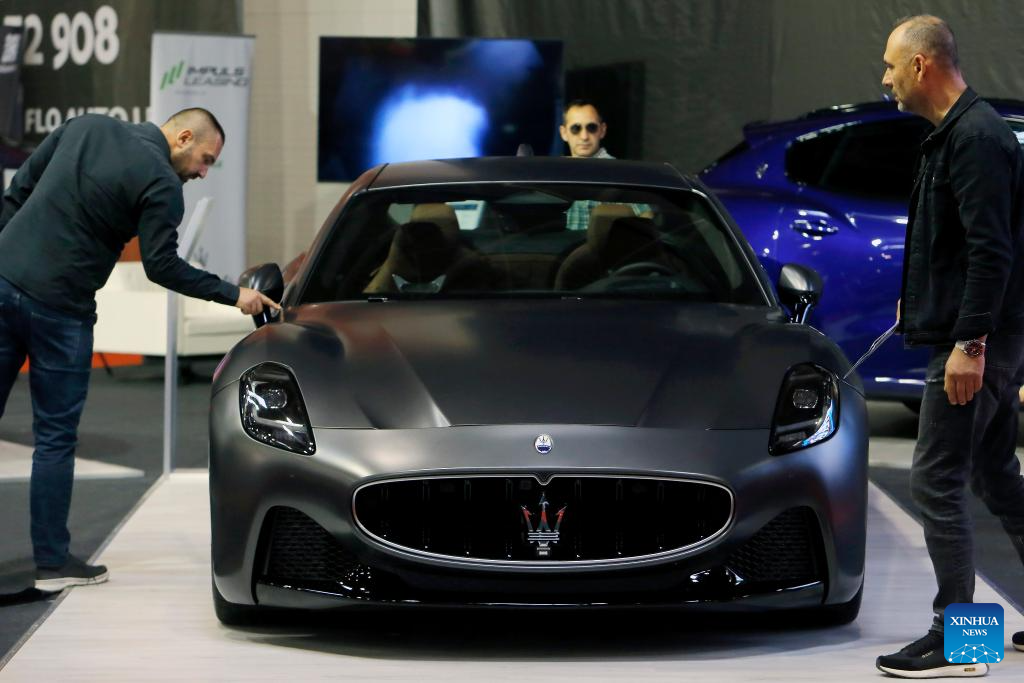 Visitors look at a Maserati Granturismo Modena MY24 car during the 20th edition of Bucharest Car Show 2023 (SAB) in Bucharest, Romania, Oct. 12, 2023. More than 40 international companies showcased their conventional, hybrid and electric vehicles, and also various accessories for cars at the exhibition. (Photo by Cristian Cristel/Xinhua)