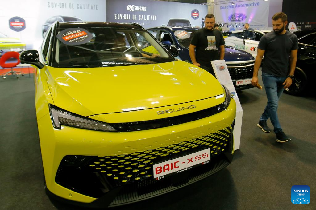 Visitors look at a BAIC X55 car during the 20th edition of Bucharest Car Show 2023 (SAB) in Bucharest, Romania, Oct. 12, 2023. More than 40 international companies showcased their conventional, hybrid and electric vehicles, and also various accessories for cars at the exhibition. (Photo by Cristian Cristel/Xinhua)