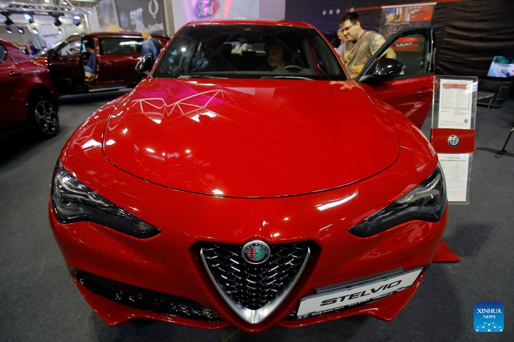 Visitors look at an Alfa Romeo Stelvio car during the 20th edition of Bucharest Car Show 2023 (SAB) in Bucharest, Romania, Oct. 12, 2023. More than 40 international companies showcased their conventional, hybrid and electric vehicles, and also various accessories for cars at the exhibition. (Photo by Cristian Cristel/Xinhua)