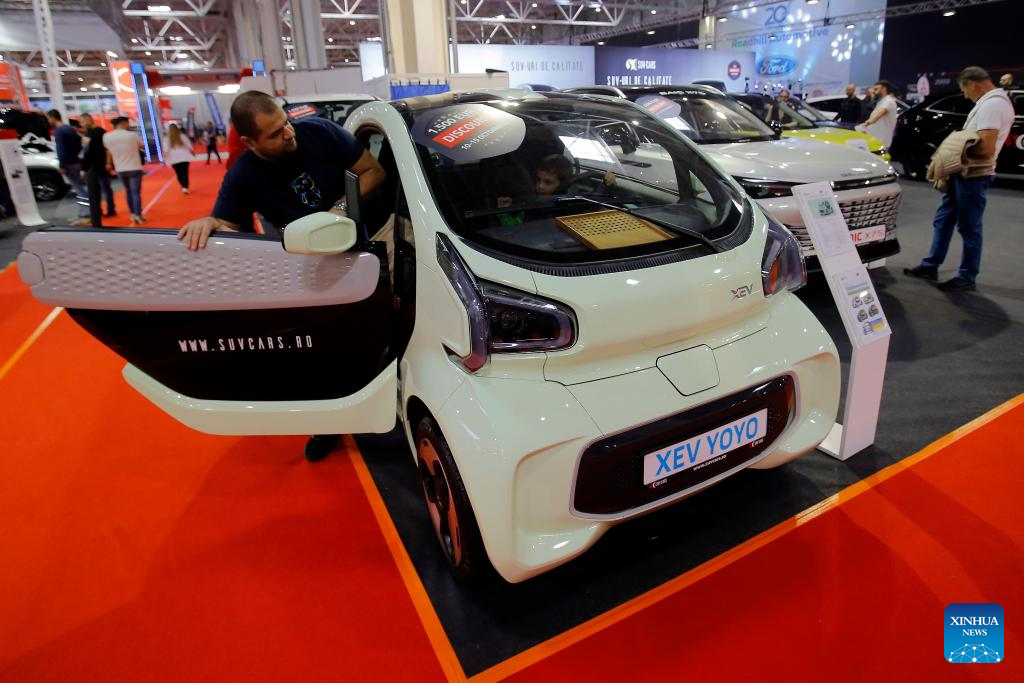 Visitors look at an XEV YOYO electric car during the 20th edition of Bucharest Car Show 2023 (SAB) in Bucharest, Romania, Oct. 12, 2023. More than 40 international companies showcased their conventional, hybrid and electric vehicles, and also various accessories for cars at the exhibition. (Photo by Cristian Cristel/Xinhua)