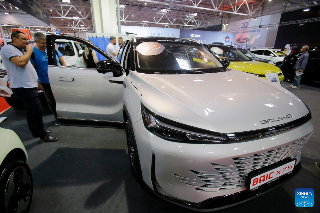 Visitors look at a BAIC X75 car during the 20th edition of Bucharest Car Show 2023 (SAB) in Bucharest, Romania, Oct. 12, 2023. More than 40 international companies showcased their conventional, hybrid and electric vehicles, and also various accessories for cars at the exhibition. (Photo by Cristian Cristel/Xinhua)