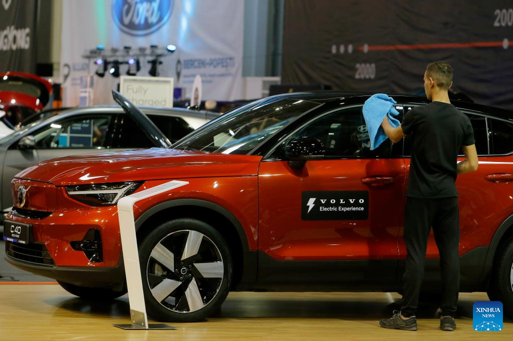 An employee wipes a Volvo C40 car during the 20th edition of Bucharest Car Show 2023 (SAB) in Bucharest, Romania, Oct. 12, 2023. More than 40 international companies showcased their conventional, hybrid and electric vehicles, and also various accessories for cars at the exhibition. (Photo by Cristian Cristel/Xinhua)