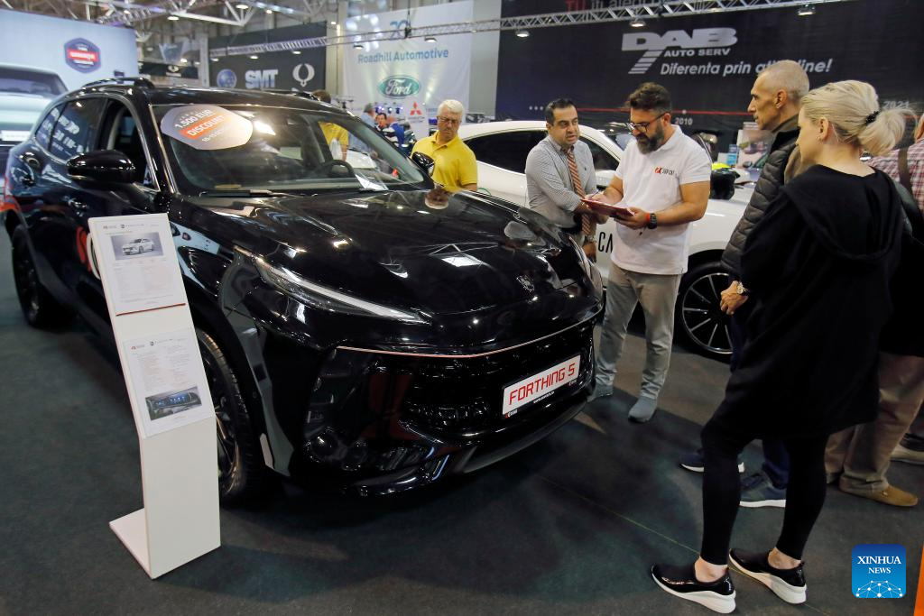 Visitors look at a Forthing 5 car during the 20th edition of Bucharest Car Show 2023 (SAB) in Bucharest, Romania, Oct. 12, 2023. More than 40 international companies showcased their conventional, hybrid and electric vehicles, and also various accessories for cars at the exhibition. (Photo by Cristian Cristel/Xinhua)