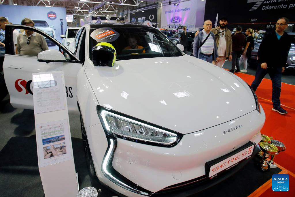 Visitors look at a Seres 5 car during the 20th edition of Bucharest Car Show 2023 (SAB) in Bucharest, Romania, Oct. 12, 2023. More than 40 international companies showcased their conventional, hybrid and electric vehicles, and also various accessories for cars at the exhibition. (Photo by Cristian Cristel/Xinhua)